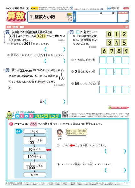 裏面下段「パソコンいらずのわくわくプログラミング」では,プログラミング的思考が育めるような問題を用意しています。