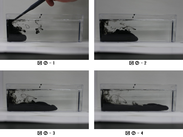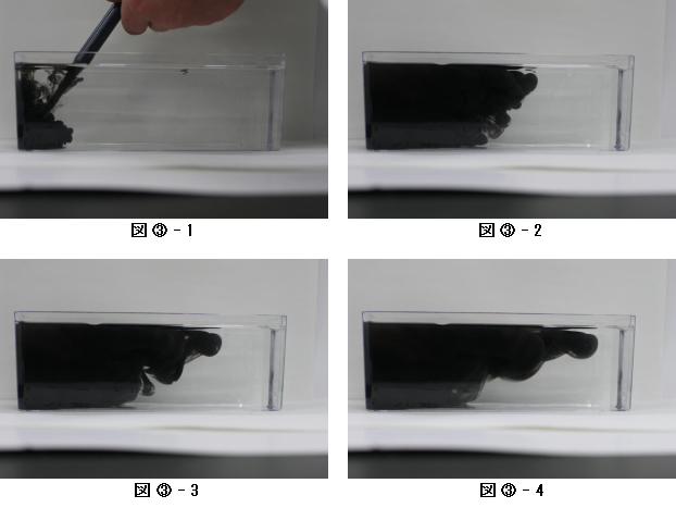 色水が浮くのですから,寒冷前線のようにはうまくいかない要素は多いです。授業では墨汁を極力うすめ,熱くし,図③-1のような角度で一気に絞り出して実践していましたが,寒冷前線ほどのインパクトはありませんでした。2度目である以上に説明を加えないとわかりづらかったようです。そこで改良を試み,最終的に以下の用具,条件で図③-1~③-4の流れで温暖前線モデルのようすが数秒にわたり見られます。