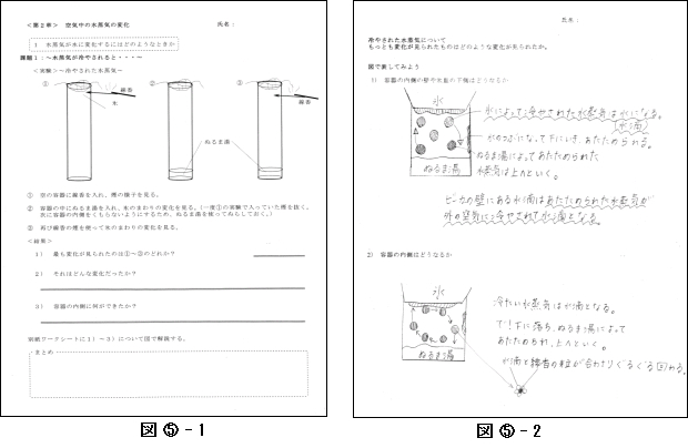 上述の実験では,煙があるから中が白くなったと思われがちです。それで,「煙だけで行なった場合」,「ぬるま湯だけで行なった場合」,「煙,ぬるま湯の両方を入れて行なった場合」で比較させて変化の最も大きかったもの,またどのような変化が見られたかを記録させるようにワークシートを用意しました(図⑤-1)。また,実験を行なわせている際,「煙は変化なかったか」「煙が増えた感じがしないか」と見どころを意識させると良いかと思います。ここでは煙の粒に水滴がついたことを言わずに,実験の後に,もう一枚のワークシートに図と文章で自分の考えたことを記述する方法で授業を展開しました。「科学的な思考・表現」の評価で参考にしています。期待する記述として図⑤-2のようなものが生徒から得られました。