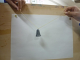 図1 鉛のおもりを輪ゴムにかけ,鉛直方向につりさげて,輪ゴムの開く角度を変え,手の感覚と輪ゴムののびを調べた。生徒一人一人が実際に自分の手で行うよう指導した。