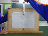 ○グラフ用紙を板に固定し,床と垂直に立てる。滑車をピンで固定しバネばかりを垂直方向で測る。 ○最初は自由な角度で,その後あらかじめ指定した4種類の角度について行う。 ○鉛直方向の上向きの力を作図し,3つの力の間にどのような関係があるか考えさせる。補助線を引かせてみる。 | ○班で協力して,正しい方法で,手際よく誤差が少ない実験ができる。【技能】 ○力の大きさを矢印で比例して図に表すことができる。【技能】 ○班で話し合い活動が行われ,活発に意見交換ができる【関・意・態】 |