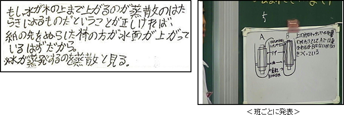 | 3 実験方法を考え表現する。 | ○他の人の意見と比較しやすいように,実験に用いる器具を限定して考えさせる。(キッチンペーパー,ガラス棒,幅広テープ,試験管,着色した水) | |