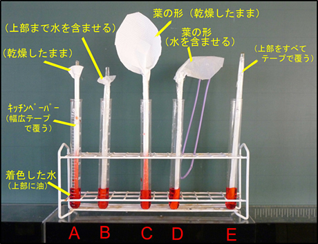 [3]A~Eをそれぞれ着色した水が入った試験管の中に入れる。(AとCはすぐに水を吸い上げるので,吸い上げがある程度止まってから,着色した水の量を同量に調整し,それぞれに油を少量加える。)