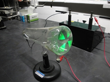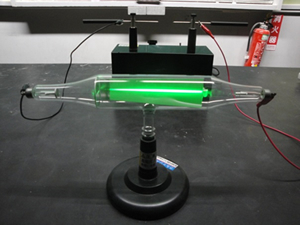 中に蛍光板しか入っていない,単純な放電管を使って説明する。 実際に電子線を見せる。 |