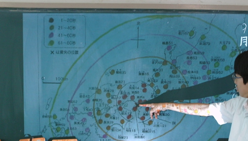 また,動画機能を使えば,生徒の作業過程を撮影して,全体に共有することができます。1年「光による不思議な現象」で,凸レンズで出来る像を作図する作業があります。この作業は,直線や平行線を描く作業があり,正確に描くには定規の当て方などにコツが必要です。そこで,机間指導の際に作業の上手な生徒の手元をデジカメで動画撮影し,その動画を見せながらポイントを解説します。動画は一時停止も可能なので,停止した状態の動画に電子黒板の描画機能で書き込みを入れて説明することもできます。