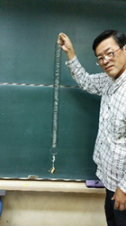 先ほどと同じく,全員で確認しながら振動する回数を数えていきます。〔写真2〕の金尺で60cmの長さで振動させると10秒間に24回振動しました。