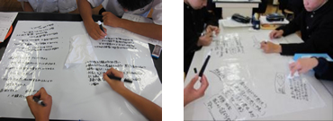 ライティングシートを使って班で考察するときは,班員が書いたそれぞれの意見を消さず,赤や青のマーカーを使って囲んだり,つないだりするようにして,まとめるように指導した。自分の意見がまとめに生かされるので,一人ひとりが自分の意見が大事にされていると実感できると考えた。班の結論はホワイトボードを使ってまとめさせた。このことで,ライティングシートに記入した班員の意見を振り返ることもできた。