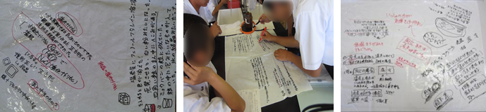 班での考察は,1年生時には,A3用紙やホワイトボードを使って行っていたが,大きさが不十分であった。そこで,サイズも大きく,経済的なライティングシートを使用することにした。このシートはマーカーとティッシュペーパーを使えば,ホワイトボードのように,字を書いたり消したりすることが容易に行える。生徒はホワイトボードを使っているとき以上に,多くの意見を書くことができていた。本実践では,ライティングシートを個人で考察させるときと,班で考察させるときに使用した。