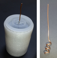 温点・冷点探し実験器具として,フィルムケースを使用し,直径1.2mmの銅線10cmをフィルムケースのふたに通した。フィルムケース内に入る銅線の部分を図のようにらせん状にすることで,熱伝導の効率を向上させた。また,銅線を通したふたの部分にシリコンシーラントを使用して,お湯や水が漏れるのを防いでいる。また,アルミ保温シートをフィルムケースに巻くことで,お湯や氷水の温度変化を防ぐことができる。温点と冷点を測定するには測定する面積と数を一定にする必要がある。今回の実験では,鉢底ネットを使用した。温点と冷点を測定する穴の数は,4×4個の計16個で行った。