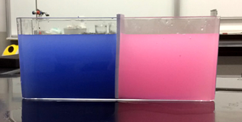 示温インク・水槽・仕切り板を使って図3のような実験装置を作成する。青色の示温インクが冷たい空気,ピンク色の示温インクが温かい空気の代わりである。
