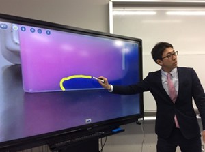 最後にクラスの全員が理解を深められるように,生徒が記録した画像を電子黒板に映して,実験のまとめを行った(図9)。図10からは寒冷前線の形を,図11からは温暖前線の形をそれぞれ確認した。このようにタブレット端末で記録しておけば,着目してほしいところを明確に示すことができ,生徒の理解を深めることができる。