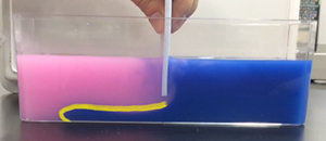 冷たい水と温かい水の境界線の形状を観察し,寒冷前線と温暖前線の違いを見いだしたい。そのためにも繰り返し実験をおこない検証することが重要である。つまり生徒が容易におこなえることが重要だ。従来の煙を使用した実験は,空気を冷やす時間・煙が充満する時間がかかりすぎてしまい,1コマの授業で繰り返すことが困難だ。色水を使った実験もあるが,普通の色水だと色が混ざってしまい,繰り返し使えない。これらの欠点を補うことができるものとして示温インクを使用した。