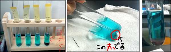 E2の課題である,「金属(鉄,亜鉛,鉛,銅)の塩化銅水溶液に対する溶け方のちがい」では,銅イオンより陽イオンになりやすい金属を,実験結果から導き出しイオン化傾向を考えることができていました。実験結果はワークシートに記入をしていますが,クロストークで説明する際により分かりやくするために,静止画にポイントを記入したり,比較し結果を検証しやすいように撮影を工夫したりする班が多く見られました。