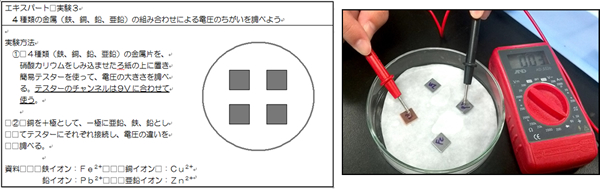 | 展開 | 3 エキスパート活動を行い,それぞれの実験結果をまとめ,自分の言葉で説明できるようになる。 | G | 3-(1)金属の表面の変化や電圧の大きさに着目させ,実験結果を説明できるようになっているか班内で確認させる。 | |