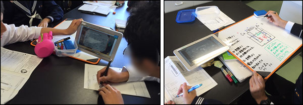本校では,タブレットPCを導入し授業を行っています。観察・実験の様子やホワイトボートにまとめた内容を動画,静止画で撮影し,メインサーバーのフォルダに保存するようにしています。生徒が必要に応じて,データを用い授業の振り返りや情報共有に利用しています。今回の授業では,タブレットPCを各班に2台準備し,課題解決のための観察・実験の様子を同時に記録しています。