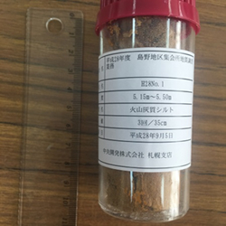 今回用いたボーリング資料は,役場に保管されているものを借りた。上位より,「砂質シルト,火山灰質砂,火山灰質シルト,火山灰質砂,砂礫,火山灰質砂,砂質シルト,砂」となっている(図1)。中学校段階においては,上位より,「泥,火山灰,礫,火山灰,泥,砂」の6層として扱うこととした。またこの中でも特に,火山灰の地層が9mの厚さで堆積していることに目を向けさせ(図2,図3),自然災害の脅威についても考えさせることで,地域の特性を活用したい。