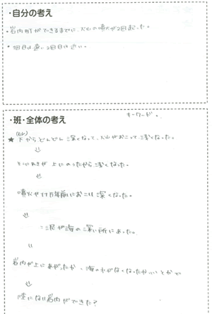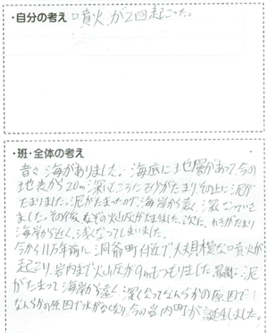 | ○個人思考をする。 ・過去に噴火が起こっている。 ・海の深さや海岸からの距離が変化している。 | 個 | ○観察結果を基に過去の様子を推測させる。 ・机間指導を行い,既習事項の確認をする。 | ☆個人で深く考えさせ,解決への見通しを持たせる。 | |