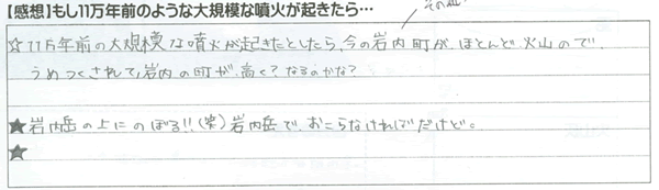 | ○感想を書く。 | 個 | ○感想を書かせる。 ・火山灰の地層の厚さに目を向けさせる。 | ■ワークシート,発表 | |