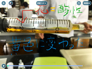 第一次はワインを用いた蒸留の実験を行い,実験のプロセスや温度変化の測定結果などをiPadで記録した。実験後にそれらのデータをプレゼンテーションアプリ(Keynote)でまとめ,説明する準備を行なった。準備では各自が記録した動画や画像をAirDropで交換し合いながらグループで一つのスライドを作成した。第二次は作成したスライドを用いて他のグループと説明し合う活動を行なった。グループで作成したスライドの操作を担当する生徒,説明を担当する生徒,補足を行う生徒といったように,役割分担しながらよりわかりやすく伝えようとする姿が見られた。