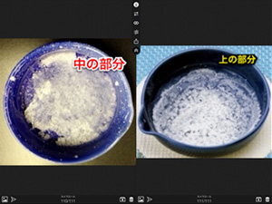 食塩水の上・中・下の濃さの違いを調べるため,各グループで2つの部分を蒸発し,残った食塩の量を比較するスライドを作成して提出した。残った食塩の量を比べて見られるよう,2枚の画像を並べて表示できるアプリ(TwinViewer)を活用し,作成した画像をロイロノート・スクール上で注釈を書き加えて提出した。他のグループが提出した結果と自分たちのグループの結果を見比べながら意見を交わす様子が見られた。