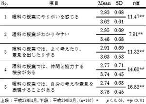 最後に,実践の前後で実施した質問紙調査の結果を分析し,実践の効果を検証した。質問には4:とてもそう思う,3:そう思う,2:あまり思わない,1:全く思わない,の4件法で回答を求めた。検証の結果,いずれの質問項目に関しても事前から事後にかけて平均値が大きく向上しており,対応のある平均値の差の検定(t検定)でも1%水準で有意な差を確認することができた。ICTを活用した多様な表現活動を軸にした一年間の実践を通じて,理科という学び全体が深まったと言える。