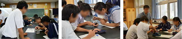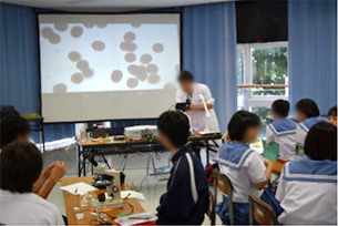 学級の枠を取り払い、友達同士で5人一組の班を作らせる。会場での班の配置は、各班の能力(顕微鏡操作の習熟、発表力、その他)を考慮し教師側で意図的に行った。