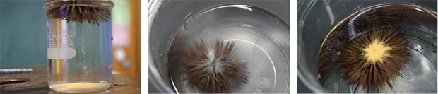 生殖孔から放卵する様子 容器中での自然放精(左)・放卵(右)の様子