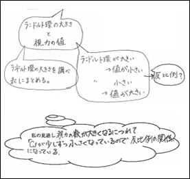 まずはじめに,子どもは,ランドルト環と視力の関係について思い浮かんだことをふきだしに記入し,その後,交流活動を設定した。「ランドルト環が小さくなるほど,視力の数字が大きくなる」,「この2つの関係は反比例ではないか」,「表やグラフにまとめてみる,規則性がありそうだから」などの発言があり,これらのふきだしを関連のあるもの同士でわけて板書し,矢印でふきだしに順序性をもたせた。そこで,ランドルト環の大きさとはどこのことなのかを確認した後,子どもは自分なりの見通しを記入し,ふきだしの順序性を手がかりとして,自力解決していった。【資料2】は子どもの見通し,【資料3】は子どもの考えの記述である。