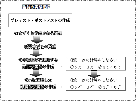 生徒の実態に応じた指導として,効果的なプレテスト作りが必要となった。つまり,生徒のつまずきが予想される学習内容について,どのような既習事項の理解が影響するのかを考え,その具体的な学習指導法を検討する。既習事項の理解度が把握できるオリジナルプレテストを作成し,そのプレテストと連動したポストテストを作成することとした。