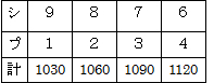 1120の十の位は2なので,十の位が2になるためにはシュークリームは1個100円なので,いくつ買っても影響はしない。 プリンは1個130円なので,3の倍数で一の位に2がつくのは,10までの数では3×4=12しかない。 だから,プリンは4個。 シュークリームは10-4=6で求められる。 |