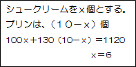 1年生の1次方程式による解き方 シュークリームの代金とプリンの代金の合計が1120円だから式が立てられて,これを解くと,シュークリームの個数が求められる。 |