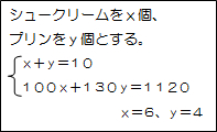 2年生の連立方程式による解き方 個数に関する式と代金に関する式を2つ作ってこれを解くとシュークリームとプリンの個数が求められる。 |
