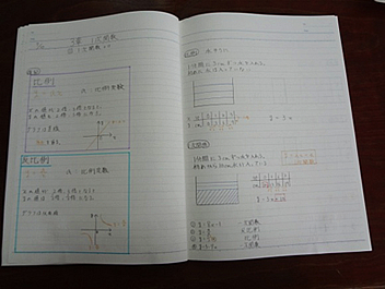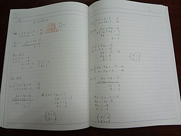 自習勉強のページは,授業の板書内容によってたくさん書かねばならないときや,書かなくてもいいときもある。目安は「3行以上は自主勉強をする」である。数学に関するものなら何でもいいので,例題を写すまたは解く,問いを解く(教科書の152ページ「くり返し練習」や章末問題,190ページ「力をつけよう」など),ワークの間違えた問題をやる,中には校長室だより(校長先生は数学の先生で,数学の知的好奇心をくすぐる問題を毎回掲載していただいている)の問題の図をコピーして貼り解き方を説明している生徒もいる。(校長室だよりは本校HPに掲載)