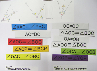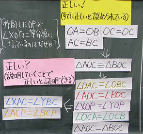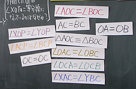 OA=OB,OC=OC,AC=BCはどの班も左に置くことができた。△AOC≡△BOCを左に置いている班が出ているので,全体で取り上げる。