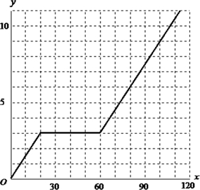 Aさんは家を出て,途中の店で買い物をしてから,おじさんの家に行きました。出発してからx分後の道のりをykmとして,xとyの関係をグラフに表すと右のようになりました。