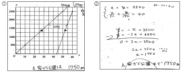 Aさんは家を出てから2500m離れた図書館まで1時間で行きました。途中,疲れたので公園で20分間休憩しました。家から公園までは分速50m,公園から図書館までは分速150mで歩きました。家から公園までの距離を求めなさい。