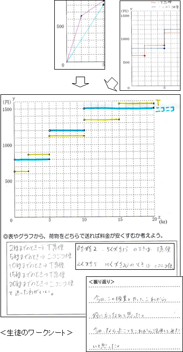 生徒は,問題場面から伴って変わる二つの数量を見いだし,「料金」が「重さ」の関数になっていることをスムーズに確認することができた。
