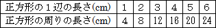 ・比例になっている。 ・正方形の周りの長さが4ずつ増えている。 |
