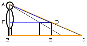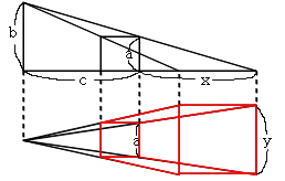 ・DE=a:立方体の高さAB=b:視点の高さ BE=c:立方体までの距離 EC=x:頂点までの距離 とすると,△ABC∽△DECだから,b:(c+x)=a:xで