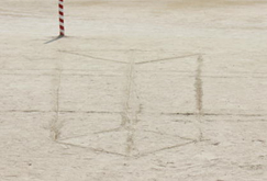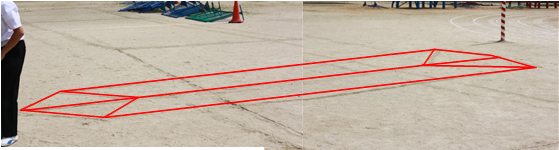立体に見える立方体の辺の長さの関係がどのようになるのかを調べるために,実際にパイプの立方体をおいて,どのようにかけるのかを試した。底面はパイプと同じ位置になるが,上面がどの位置にくるのかわからない。そこで,地面の視線の先に点を取り,上面をかくことで,「視線の高さ」,「パイプまでの距離」,「パイプの高さ」,「頂点までの距離」の距離の関係を見つけることができた。そこから,横から見たときの様子を平面図に落とし,一般化を進めることができた。