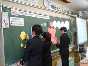 図3のまとめからもわかるように,多くの生徒が,1点に集まる角の大きさの和に着目して,敷き詰められる正多角形を探していた。ここで,前時の学習で気づいた敷き詰めの条件として,1点に集まる角の和が360°であることが有効に利用できた。その成果として,課題1の活動では,大半の生徒が正三角形,正方形,正六角形の3種類の敷き詰めを考えていた。この後,実際に黒板の方で,希望する生徒に敷き詰めを行わせた。(写真2)。