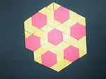次に,図形の敷き詰めに関わってのルールを確認させた。図形を敷き詰める活動の中では,条件次第でねらいが違ってくる。今回の学習において,全員で敷き詰めのルールを確認させた。その時に,1点に各頂点が集まる条件を理解させるために,生徒たちが知っていたタングラムを活用した。