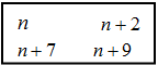 <説明> 正方形の左上の数をnとすると,残りの3つの数は右の表のように表される。対角にある数の積の差は,