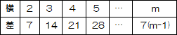縦を2と固定して横の長さをかえると,右の表のようになる。一般化すると,2×mの長方形では,対角の数の積の差は,7(m-1)となる。