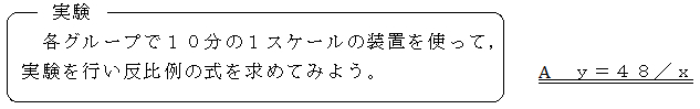 各班に分かれて実験を行う。実験で得られた数値から反比例の比例定数を割り出し,式を求める。等間隔で入れたスリットからレーザー光線を鏡に当て,反射した光の高さを方眼紙で測定して表にまとめる。測定値であることから誤差があることを踏まえて比例定数を求めるように注意する。生徒は(鏡とレーザーポインターの距離)×(壁に当たる光の高さ)=48を割り出し,反比例の式を求める。