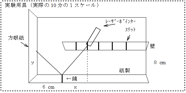 実際の実験用具は横に寝かせて使用した。これも鏡に当たる場所やスリットの幅によって実験結果が左右されるので,鏡の幅とスリットの幅は2mm以下にするようにした。また,それぞれの壁も垂直になっていなければ誤差が大きくなるため,金具で補強するなどして,なるべく垂直になるように工夫した。生徒の実験結果にはそれほど大きな誤差はでなかった。
