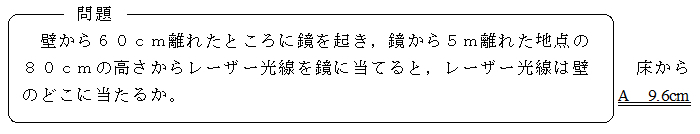 生徒は10分の1スケールの実験装置で(鏡から光源までの距離)×(壁の光の高さ)=48を得ているので,それを利用して答えを導くことができる。実験で式を導いた時点では正解を発表していないので,その式が正しいかどうかの答え合わせの意味合いもある。実際に生徒が予想した位置の壁にそれぞれポイントを記し,実際にやってみることで答えを確認する。生徒は実験によって得られた反比例の式を利用して問題を解くことができたことに喜びを覚えていた。