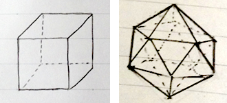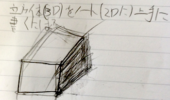 次元の話のあとで,「立方体(3D)を黒板(2D)に“上手に”かくには,どうしたらよいか」という課題を与え,生徒達は課題に取り組む。小学校の学習がいきていて,7割の生徒はポイントを押さえてかくことができるが,残りの3割の生徒は上手にかくことができない。右の図は,残念ながら上手にかけていない例である。ここでのポイントは主に二つあると私は考えている。