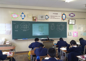 最初にデジタル教科書を使って,身の周りにある様々な建造物の例を紹介した。「その建造物が,おおよそどのような形をしているのか」という発問に対して,生徒達は活発に発言をした。そして,その立体の名称を確認し,実際の立体を見せた。やはり,身近にあるものを用いて導入を行うことは,数学が実生活と結びついていることを実感させるためにも大切である。