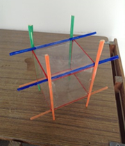 右の図のような教具を用意した。作り方はいたってシンプルである。立方体の各辺に対して,色のついた割り箸をセロハンテープで固定する。もちろん,同じ色の割り箸は平行な関係になっている。また割り箸が,各辺より長くなっているのは,直線が無限に伸びていることをイメージしている。(可能ならば,立方体の各面が無限に広がっているイメージのものを作った方がいいのかもしれない)